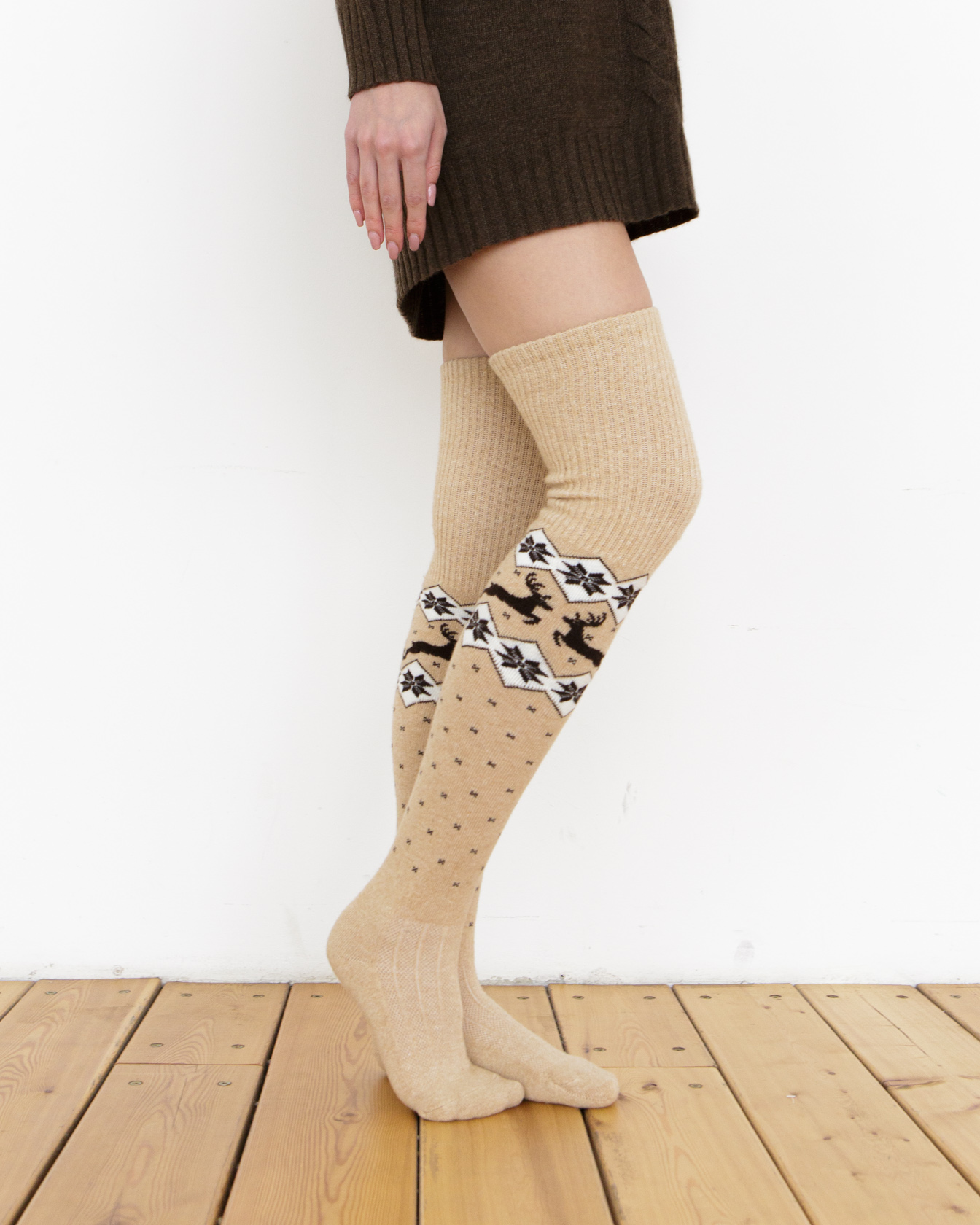 Теплые чулки из монгольской шерсти бежевые с рисунком
