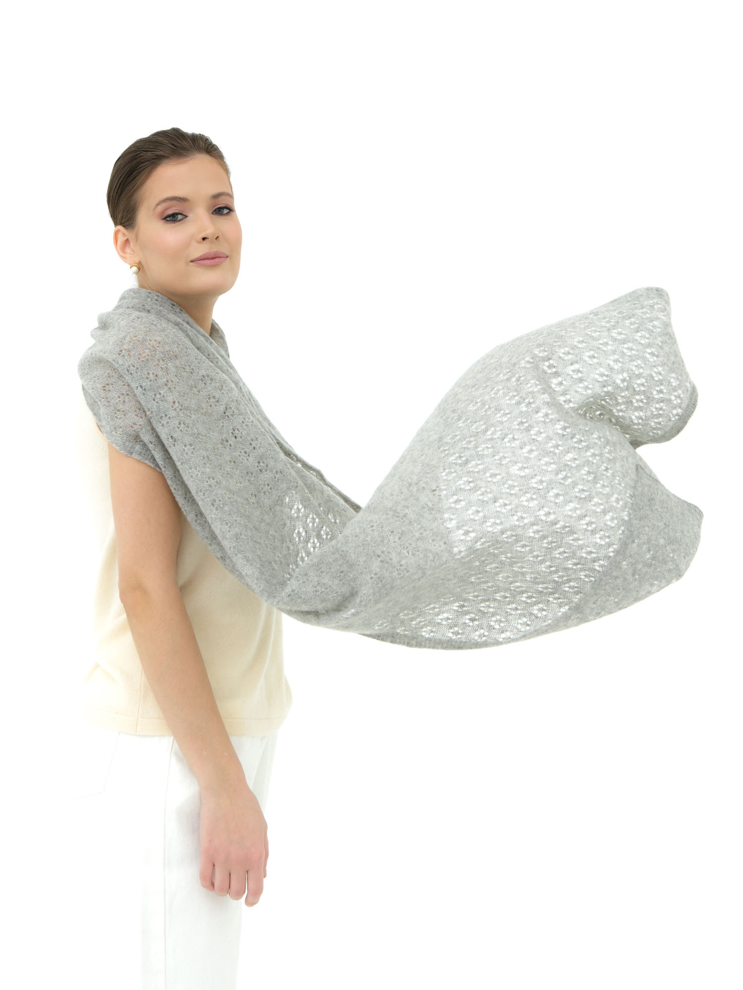 Модель выполнена в свободной форме с выразительной фактурной вязкой, создающей объёмную текстуру. Пластичная структура материала позволяет палантину красиво струиться и формировать мягкие складки.