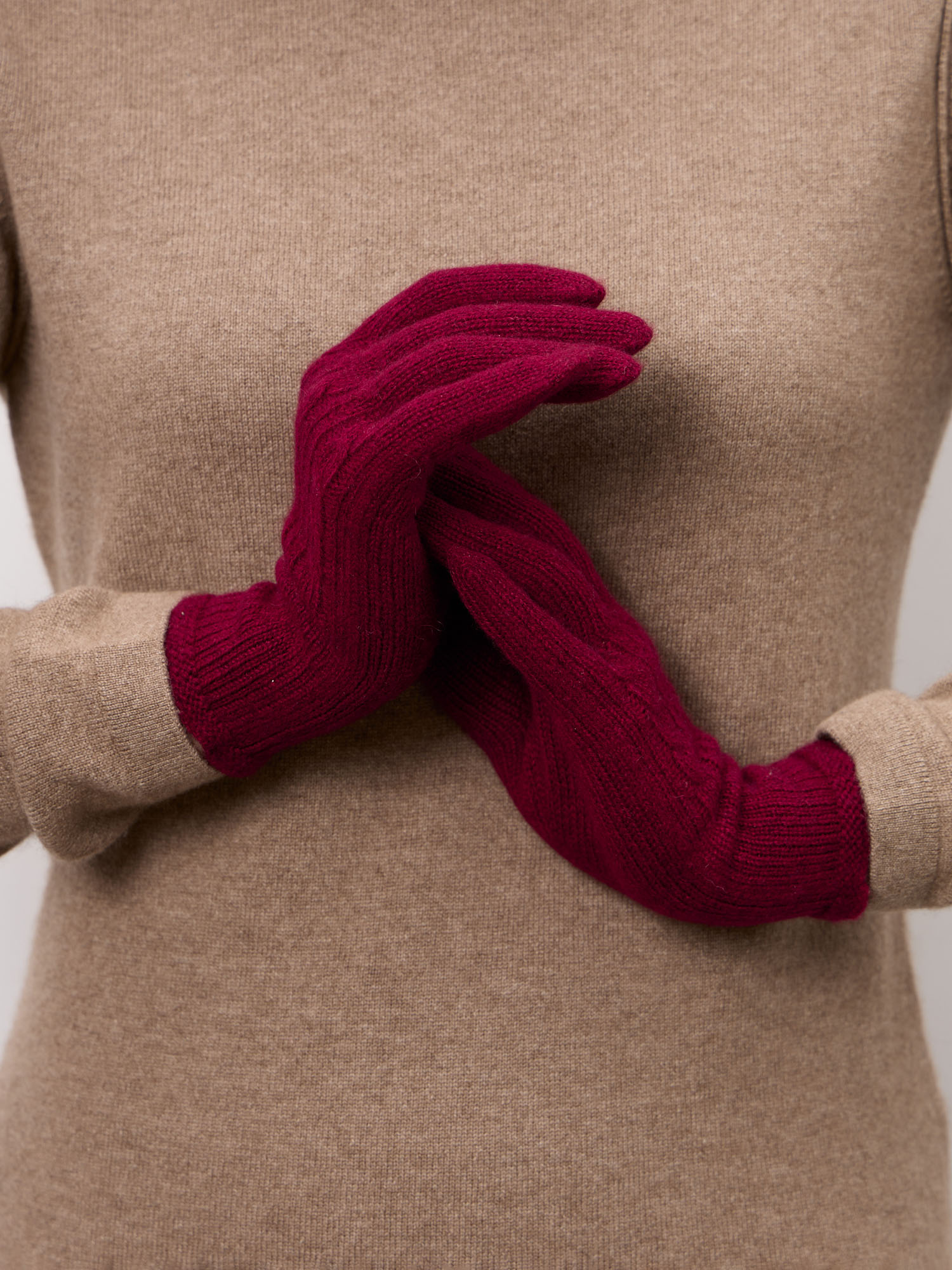 Модель выполнена с акцентом на классическую вязку «косы», которая создаёт объёмную текстуру и делает перчатки визуально выразительными. Такой узор подчеркивает премиальность изделия и добавляет образу элегантности.