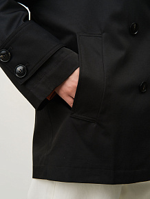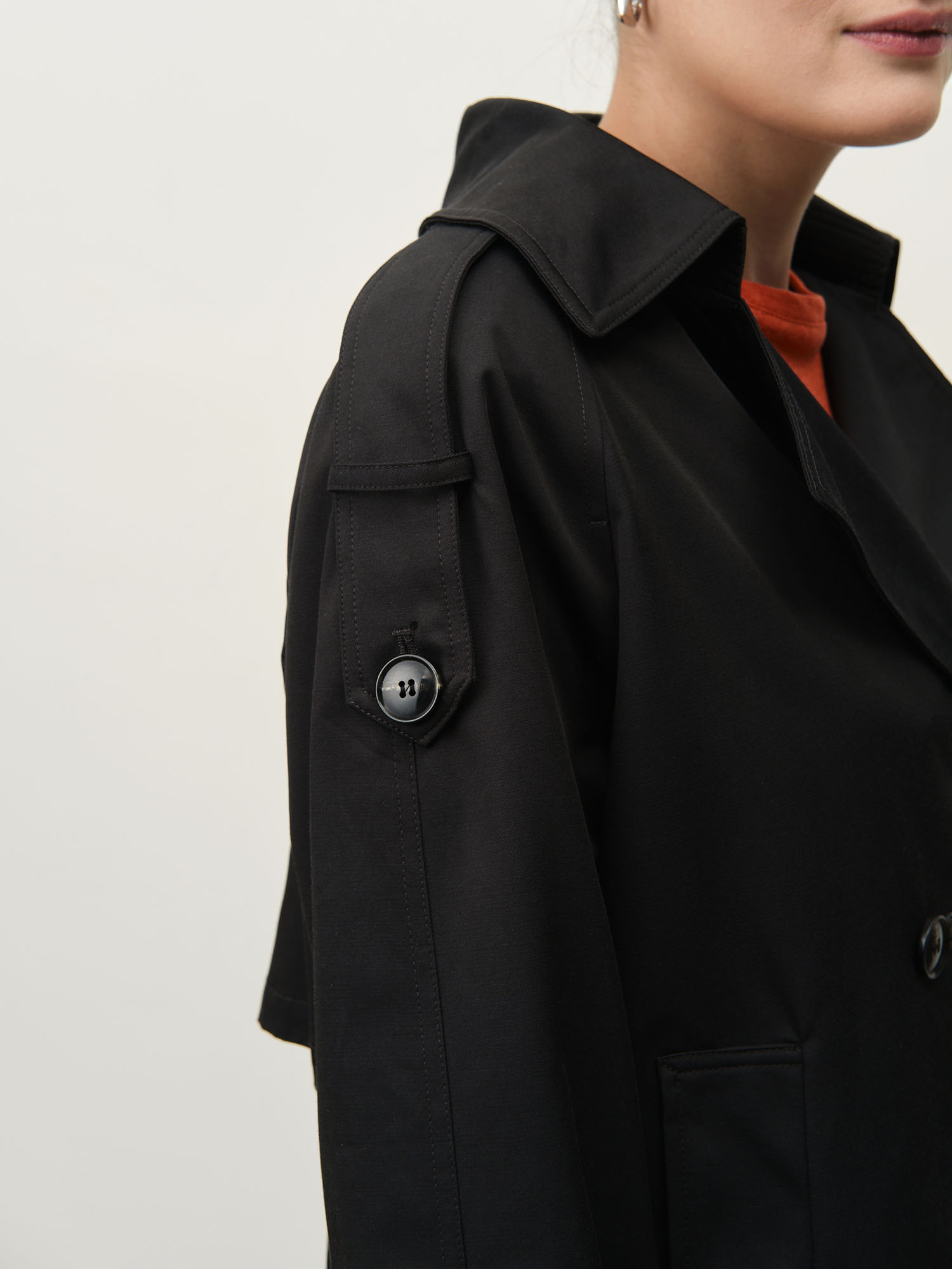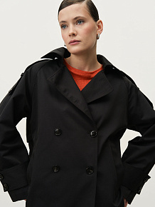 Свободный силуэт с классическими элементами тренча. Двубортная застёжка и акцент на плечах создают структурированный и современный образ.