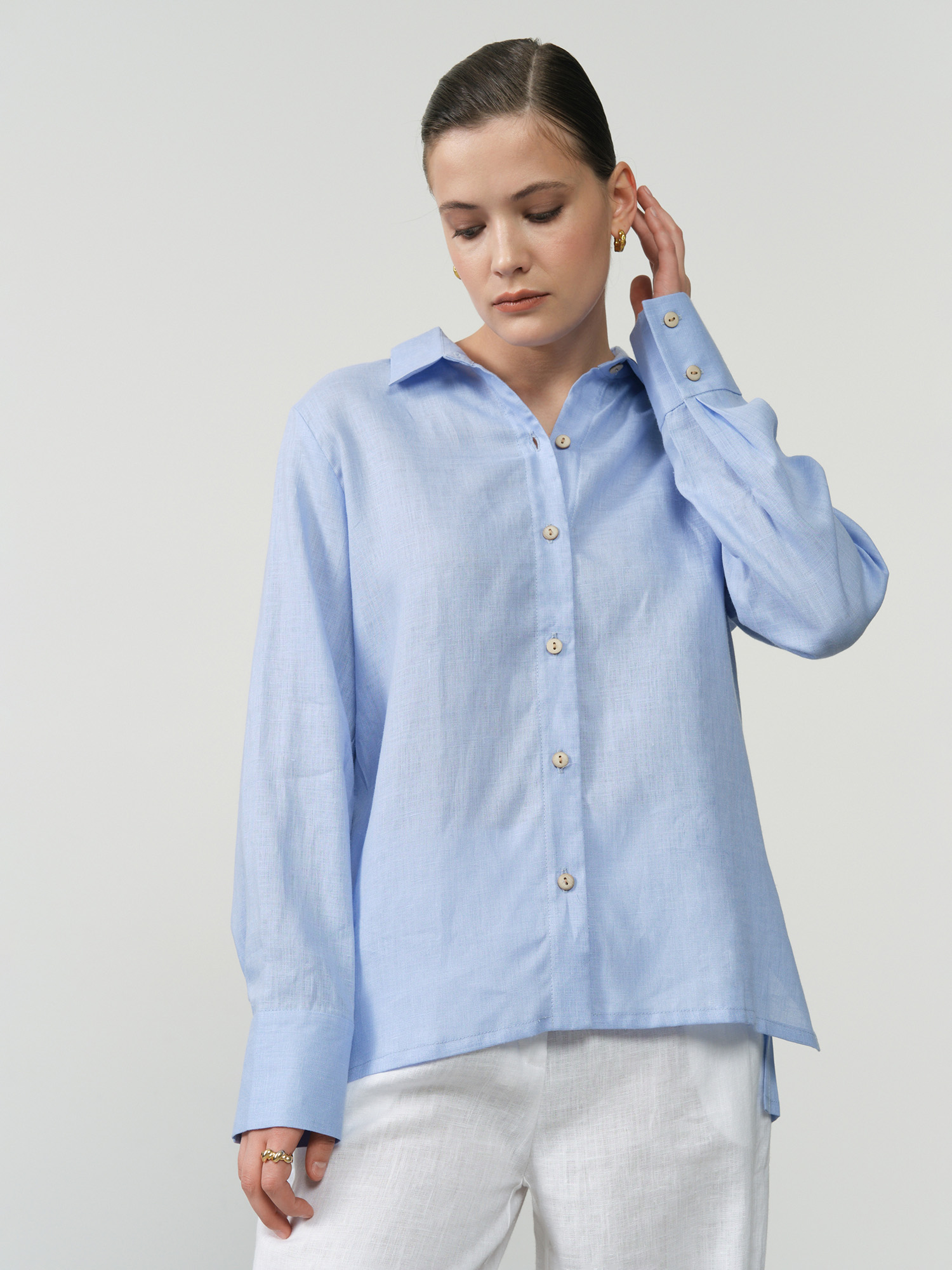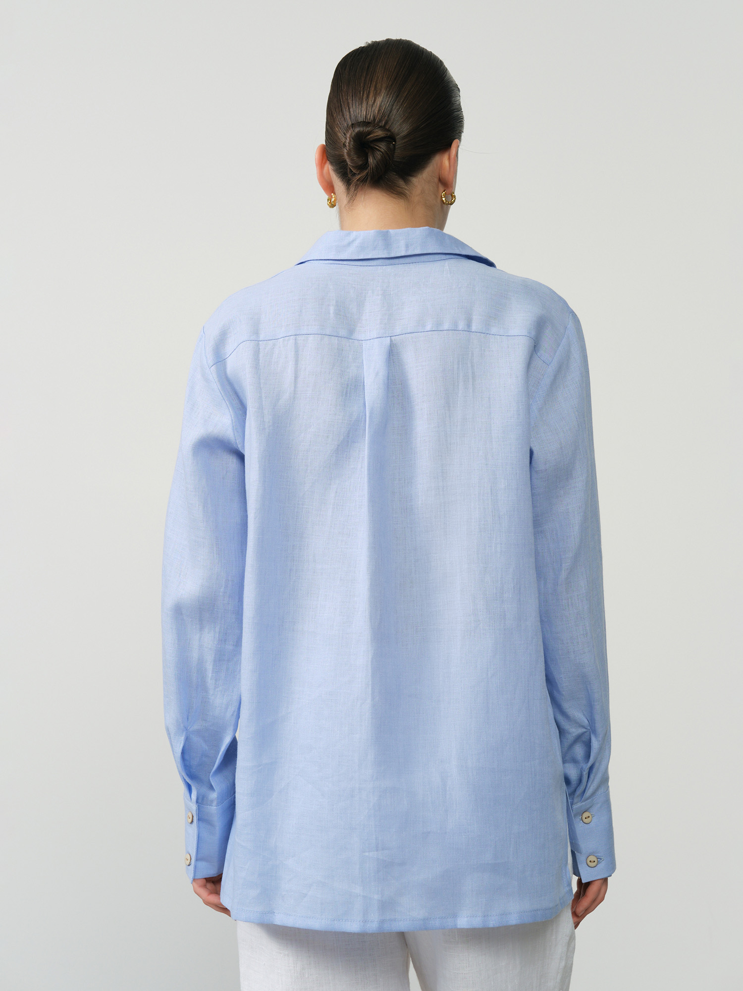 Застёжка на пуговицы, длинные рукава с манжетами, аккуратные швы, лёгкая текстура ткани.