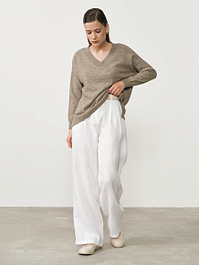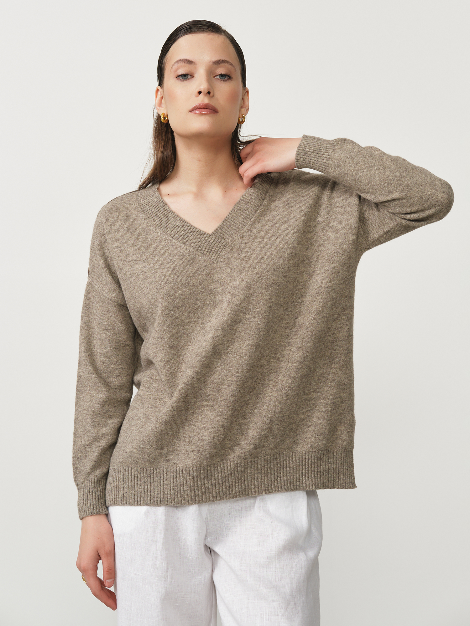 Модель выполнена в минималистичном стиле с V-образной горловиной и длинными рукавами. Чистые линии кроя и мягкая фактура трикотажа подчёркивают натуральную красоту материала.