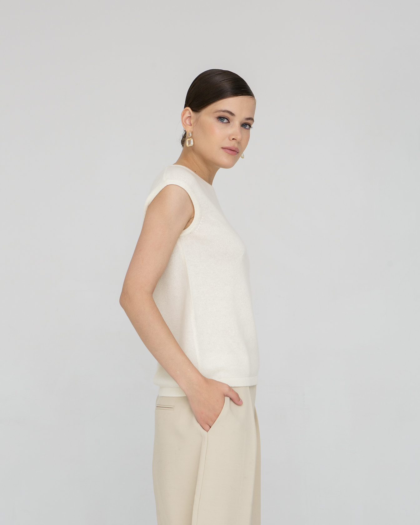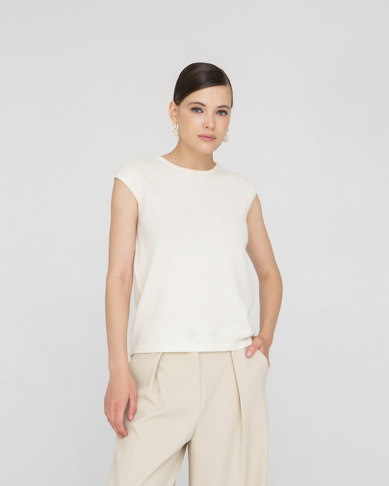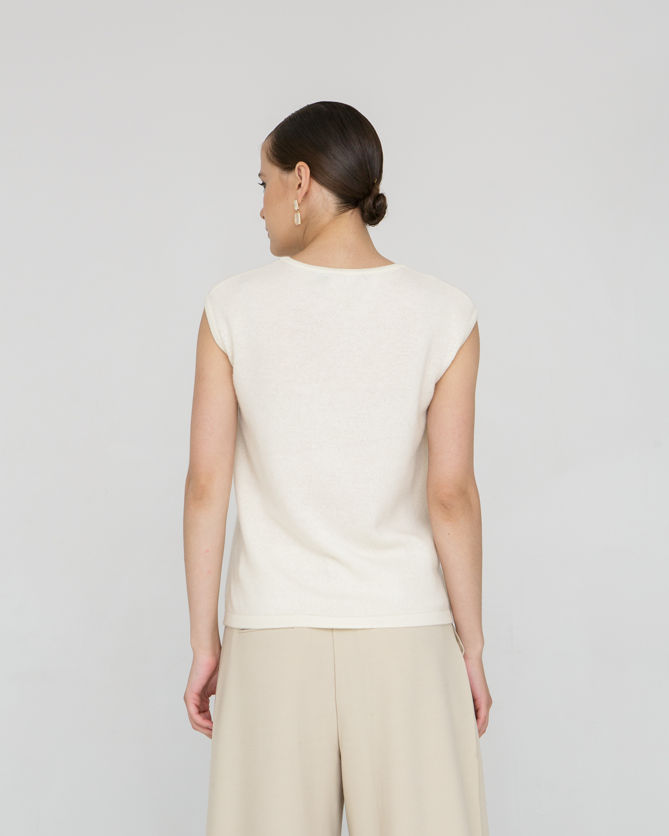 Модель выполнена без рукавов с аккуратной круглой горловиной. Минималистичный крой подчёркивает современную эстетику изделия и делает его универсальным элементом гардероба.